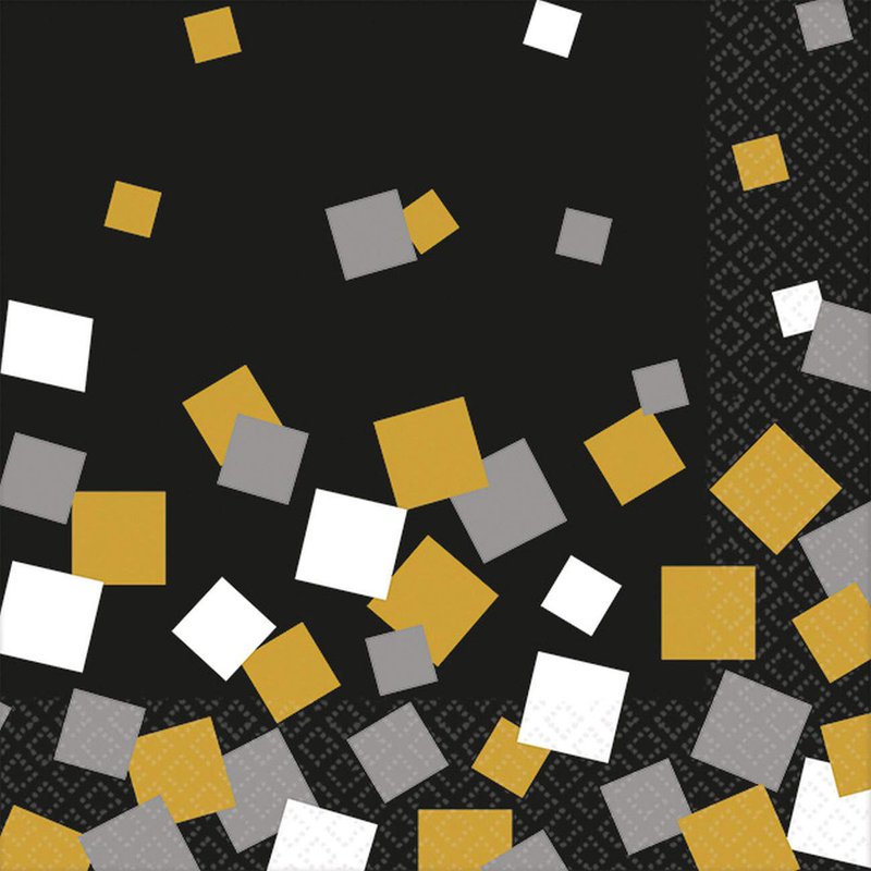 - Features large white, gold and silver falling confetti squares against a black background