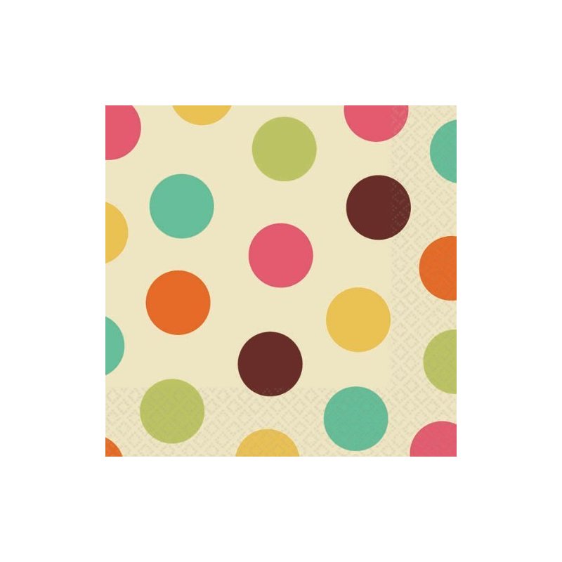 Add our Natural Instincts Eco Beverage Napkins to your tables! Each napkin features an ivory colored background with colorful polka dots. Measures 5" x 5". Includes 16 - 2 ply paper napkins per package.