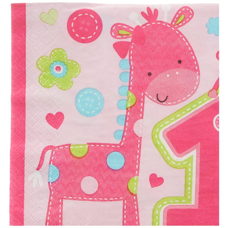 - Pink napkins featuring a big pink number 1 with a multicolor spotted giraffe, pink monkey, buttons, hearts and flowers