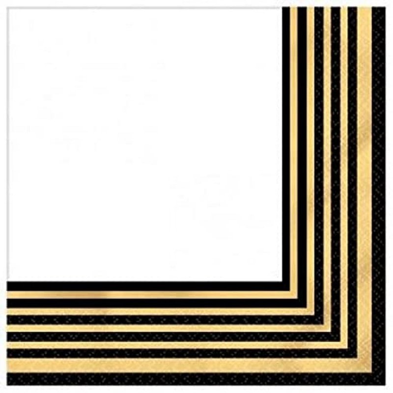 Complete your black and gold tableware with Black & Metallic Gold Stripe Premium Beverage Napkins! These white paper napkins feature a black and metallic gold stripe pattern along the edges. The black and gold napkins are perfect for a grad party, New Year's Eve party, or any other special occasion. Add some shine to the tables at your next event with these napkins! Black & Metallic Gold Stripe Premium Beverage Napkins product details: 16 per package 5in x 5in when folded