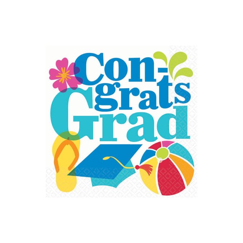 Add some color to your Grads luncheon with these Summer Splash Grad Beverage Napkins. Each napkins has the words "Con-grats Grad" in blue on a white background with summer accents such as a beach ball, flip flop, cap and flower. Each napkin is 9.75" square and comes in a pack of 16. 1 set per package
