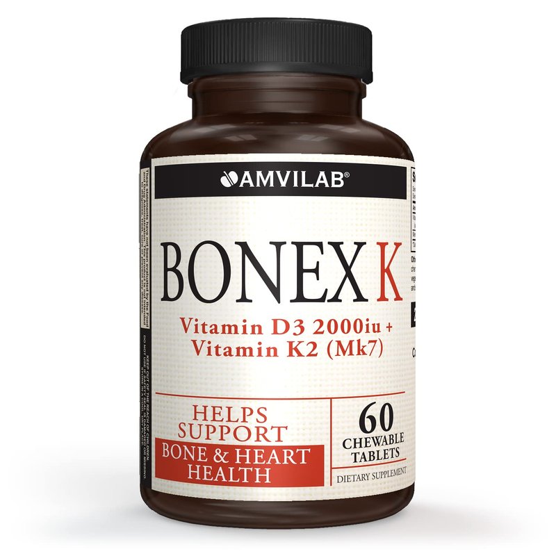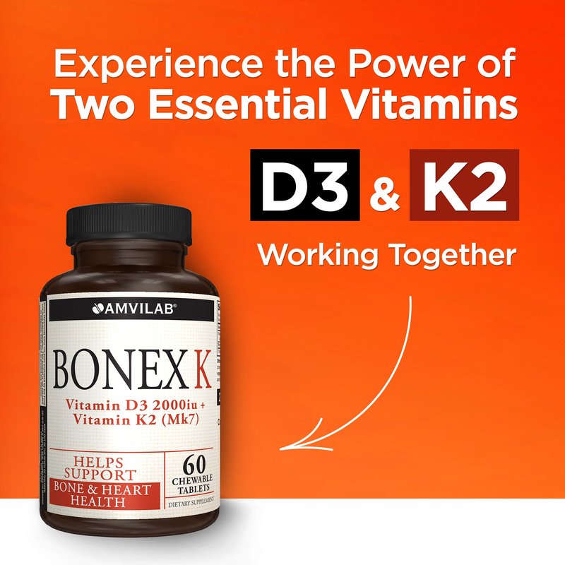 AMVILAB Bonex K Supplement|Vitamin D & K Complex|Supports Heart, Bones & Teeth Health|2000IU Vitamin D3 & 75mcg Vitamin K2|Non-GMO|Small & Easy to Swallow|60 Day Supply Chewable Tablets