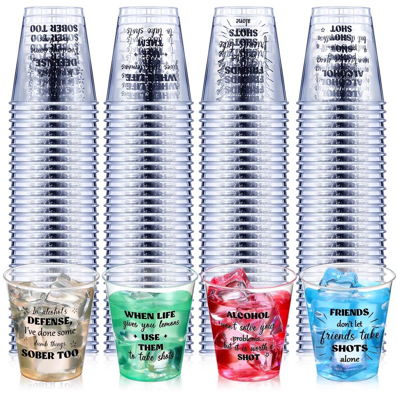 Features: The mini shot glasses plastic adopt a clear design, which is helpful for you to display your drink or beverages, making them look delicious and exquisite. Rich quantity and style, the plastic tasting glasses are enough to use in various kinds of occasions, the text printed on the shot glasses nicely spice your parties up. Suitable as thoughtful gifts for family, relatives, friends and neighbors. Specifications: Material: plasticColor: clearSize: Capacity: 2 ozDiameter of the mouth: about 4.6 cm/ 1.81 inchesBase: about 3 cm/ 1.18 inches in diameter Height: about 4.9 cm / 1.93 inches Package includes: 100 x Plastic shot glassesNotes: Manual measurement, please allow slight errors on size. The color may exist a slight difference due to different screen displays.