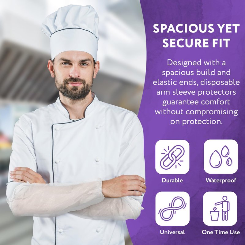 - Pack of 100 White Disposable Sleeves To Cover Arms, 18 Inches. Cooking sleeves with elastic ends are a blend of functionality and fashion. Crafted for both men and women, sleek blue design of waterproof arm sleeve adds a professional touch to any task, from painting to cleaning.
