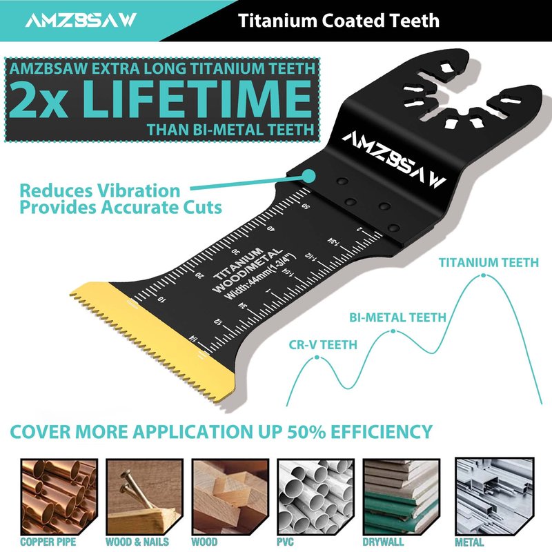 - 【3 Types 16PCS Titanium Oscillating Saw Blades】Compared with ordinary saw blades, the hardness of titanium saw blades is increased by 50%, and the service life is extended by 2X. Includes 3 different types of oscillating multitool blades, 6pcs 1-3/8"inches, 5pcs 1-3/4"inches, and 5pcs extra long 1-3/4"inches.