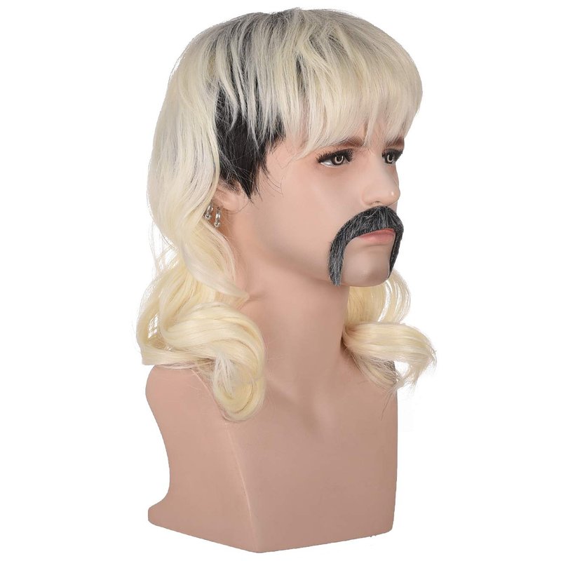 AMZCOS 70s 80s Rocker Mullet Wig Set for Men | Dark Roots Short Blonde Wavy Wigs for Mens Halloween Cosplay Party with 6 Earrings and Mustache