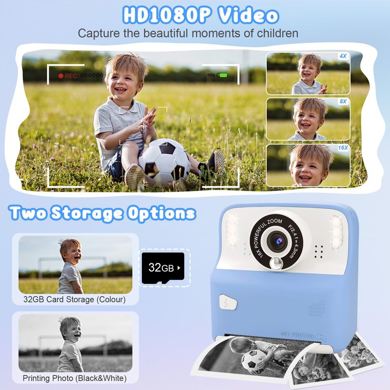 - 📸【Instant Print Camera For Kids】The kids instant print camera utilizes thermal printing technology, the need for inkless and toners. With just one button to shoot and one button to print, your kids will have a blast capturing memories and instantly printing them in black and white. This camera also allows color photos to be stored on the SD card. It's a trendy and cute option for children who love photography.