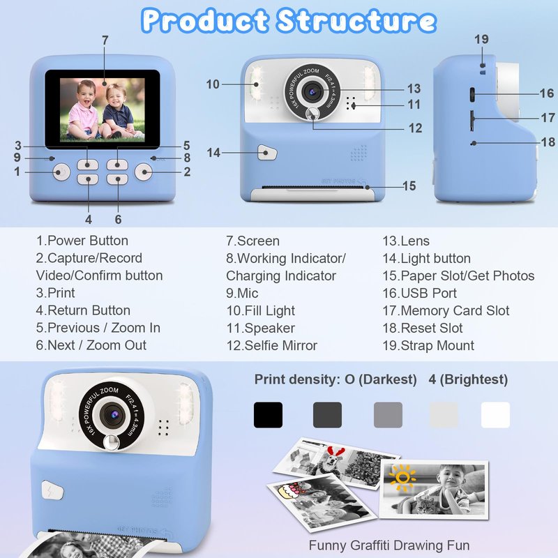 - 🎁【Perfect Gift for Kids】Our kids instant print camera is the best present for girls and boys aged 3-12. Whether it's birthdays, 🎅christmas, holidays, or trips, this camera will bring endless joy. It's a mini, portable, and trendy toddlers camera that instantly prints cute, black and white photos. Ideal for little ones who love to take pictures and for those who want to create their own instant memories.