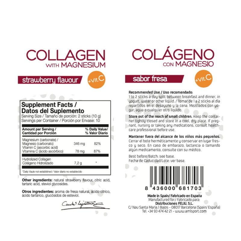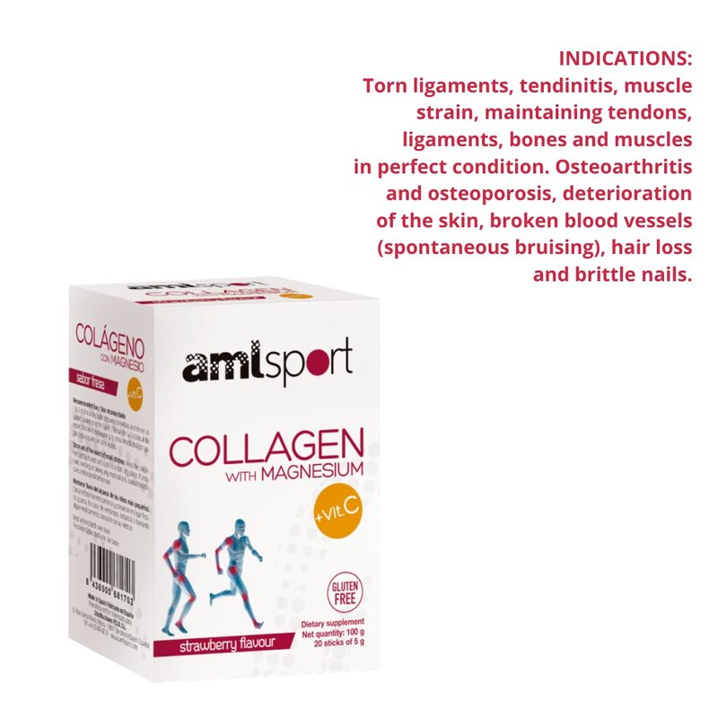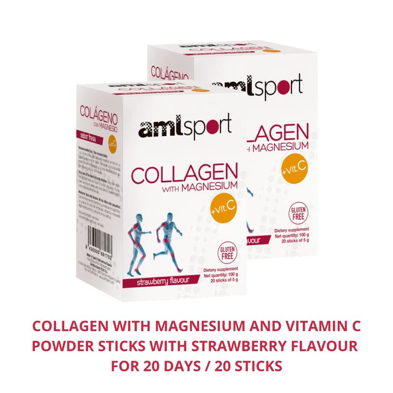 Ana María Lajusticia AML Sport - Collagen with Magnesium with Vitamin C Sticks - Strawberry Flavour - Travel Pack -20 Sticks. Hydrolized Collagen. Dairy, Gluten and Sugar Free.