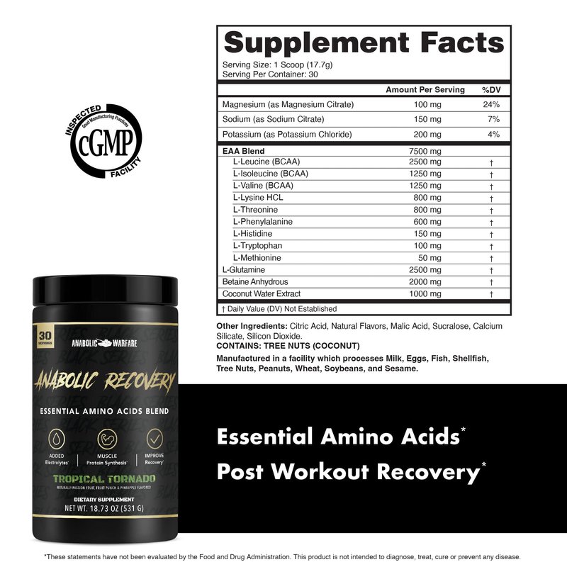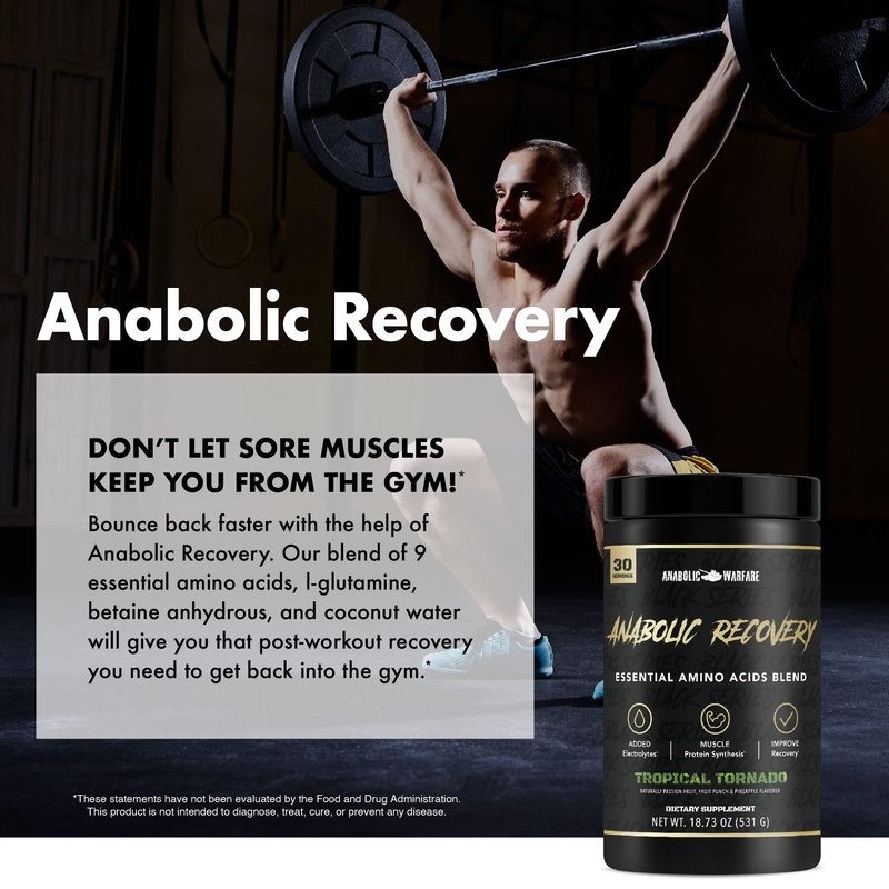 - Post Workout Recovery*: Giving your body the optimal time and nutrients it needs will have you crushing plateaus in no time; Anabolic Recovery contains 7500mg of 9 Essential Amino Acids per serving, supporting muscle growth and promoting protein synthesis*