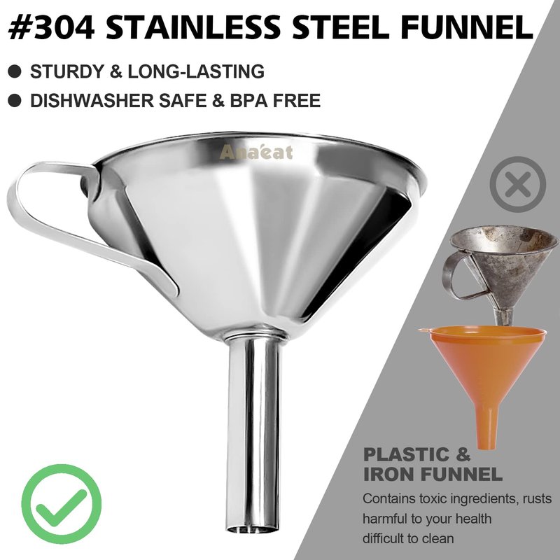 - 【 SAFE & LONG-LASTING 】: Anaeat Stainless Steel Funnel is made of professional food grade material, which resist corrosion, No Bending, No Scratching and No leaking. BPA free & Heat resistant at -40°C to 250°Celsius, with its Durable, long lasting ,hard to break materials, you might rest assured the quality of our product.