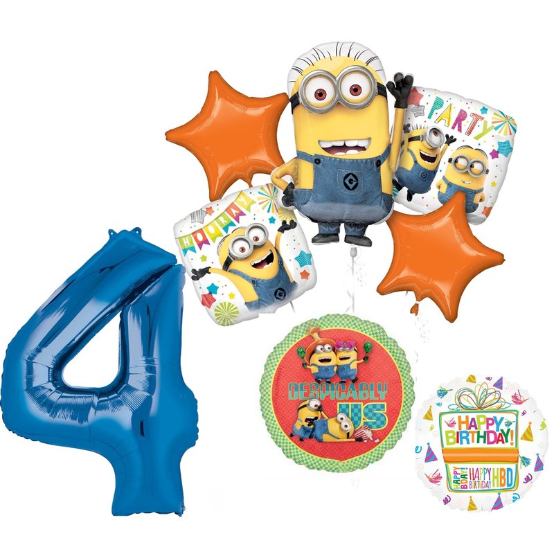 - (1) 34" Giant Blue Number 4 Foil Balloon, (1) 17" Despicable Us Round Foil Balloon, (1) 25 inch Waving Minion Foil Balloon, (2) 17" Minions Square Party Balloons, (2) 19 inch Orange Star Foil Balloons and (1) 18" Mayflower Products Happy Birthday Present Foil Balloon. Ribbon Not Included. All Anagram Licensed Balloons are Made in USA. Founded in 1977, Anagram International leads the world in innovating and manufacturing foil balloons.