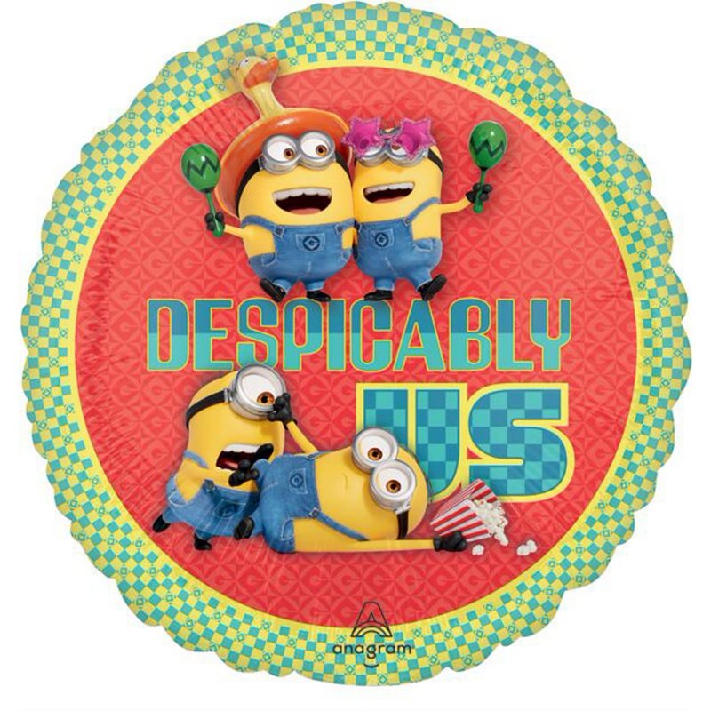 - (1) 25" Minions Shape Foil Balloon, (1) 22" Minions Despicable Me 4 Octagon Shape Foil Balloon, (1) 34" Giant Blue Number 5 Foil Balloons, (2) 17" Despicable US Round Foil Balloons, (1) Mayflower Products Happy Birthday Present Foil Balloon (2) 18" Yellow Star Shape Foil Balloons and (8) 11" Latex Balloons 2 Each of Yellow, Blue, Red and Lime Green. Ribbon Not Included. All Anagram Licensed Balloons are Made in USA. Founded in 1977, Anagram International leads the world in innovating and manufacturing foil balloons.