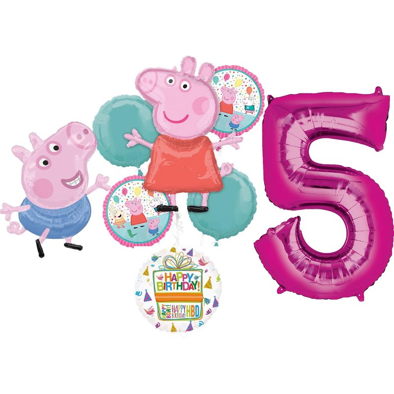 • (1) 32" Peppa Foil Balloon, (1) 24" George Foil Balloon, (2) 17" Round Peppa Foil Balloons, (1) 34" Giant Pink Number 5 Foil Balloon, (1) 18" Mayflower Products Happy Birthday Present Foil Balloon and (2) 18" Round Robins Egg Foil Balloons. Ribbon Not Included. All Anagram Licensed Balloons are Made in USA. Founded in 1977, Anagram International leads the world in innovating and manufacturing foil balloons.