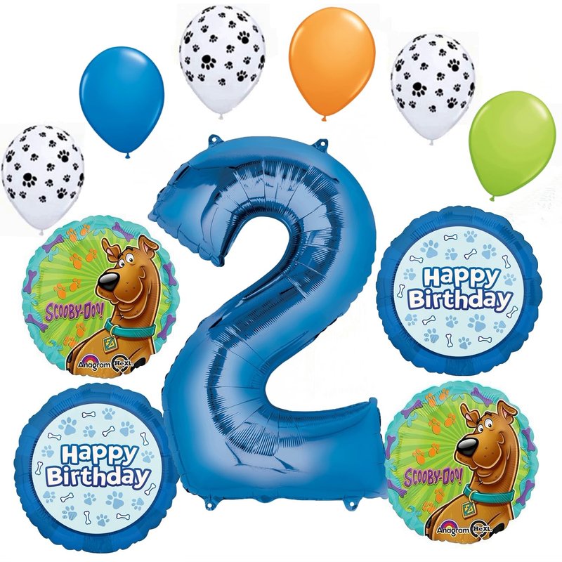 - (2) 17" Scooby Foil Balloons, (1) 34" Giant Blue Number 2 Foil Balloon, (2) 17" Paw Print and Dog Bones Round Happy Birthday Foil Balloons and (6) 11" Latex Balloons, 3- White with Black Paw Print and 1 each of Blue, Orange and Lime Green. Ribbon Not Included. All Anagram Licensed Balloons are Made in USA. Founded in 1977, Anagram International leads the world in innovating and manufacturing foil balloons.