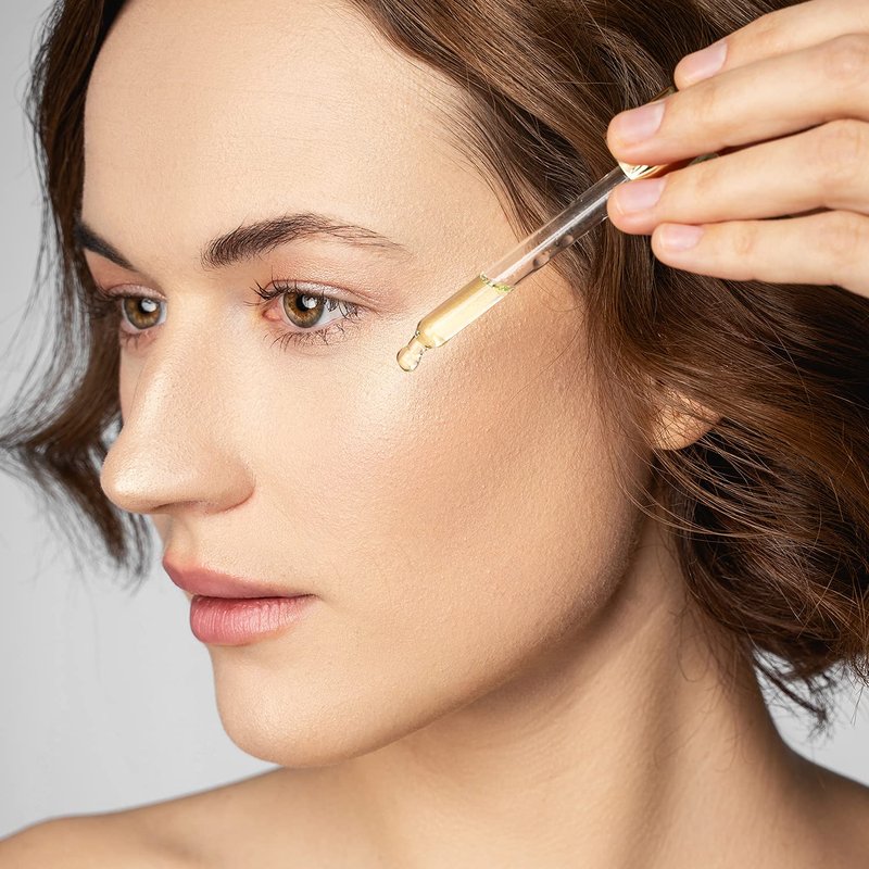 2.With your finger, dab the oil in small dots onto cleansed skin, avoiding your eye area. Then gently smooth and press the oil onto your face and neck, using the whole surface of your hands. Smooth the oil from nose to ears, eyebrows to hairline, and neck to jawline.