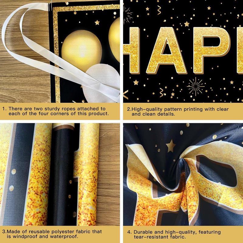 MATERIAL: The Black and Gold Happy 18th Birthday Banner is made out of high quality, durable, and reusable polyester fabric. Polyester is a synthetic fiber that is known for its strength and durability, making it an excellent choice for a banner that will be used for special occasions like an 18th birthday celebration. Polyester is also resistant to moisture, so the banner will hold up well in outdoor settings where it may be exposed to rain or dew.