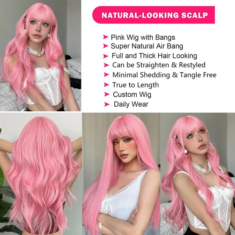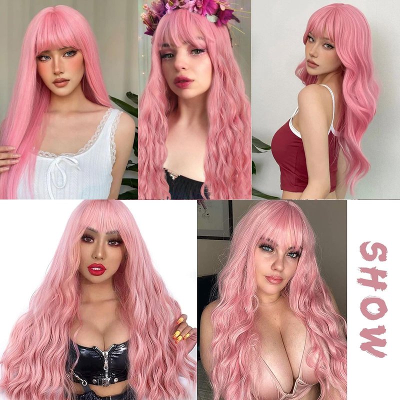 - [Various Suitable Occasions Of Pink Wigs] This Long Wavy Synthetic Wigs is Suitable for Everyday Wear, Cosplay, Parties, Halloween, Concerts, Weddings, Birthday, Dates, Concerts, Fashion Shows, and It Will Also be a Nice Gift for Your Friends or Family. You Can Trim and Restyle the Cute Bangs As U Like.