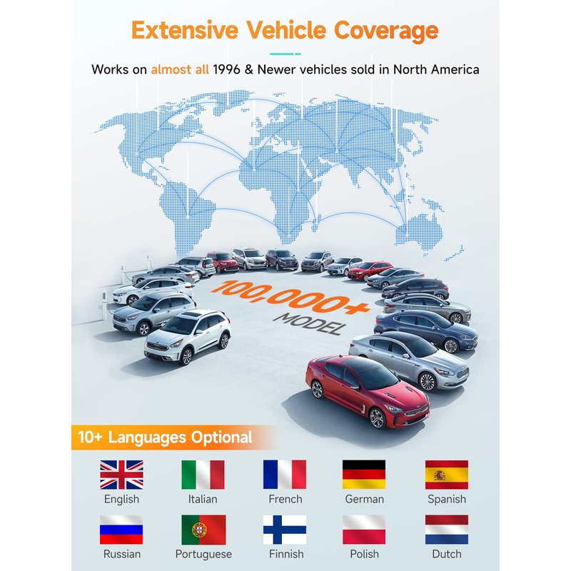- WIDE COMPATIBILITY - Recommended by YouTube star Scotty Kilmer on his channel. Works on most vehicles sold in the U.S. with a model year of 1996 or newer; Supports all OBDII protocols: KWP2000, ISO9141, J1850 VPW, J1850 PWM and CAN (Controller Area Network); Displays in English, German, French, Spanish, Finnish, Dutch, Russian and Portuguese; Requires no battery or charger as the unit is powered directly from the OBDII Data Link Connector in the vehicle.