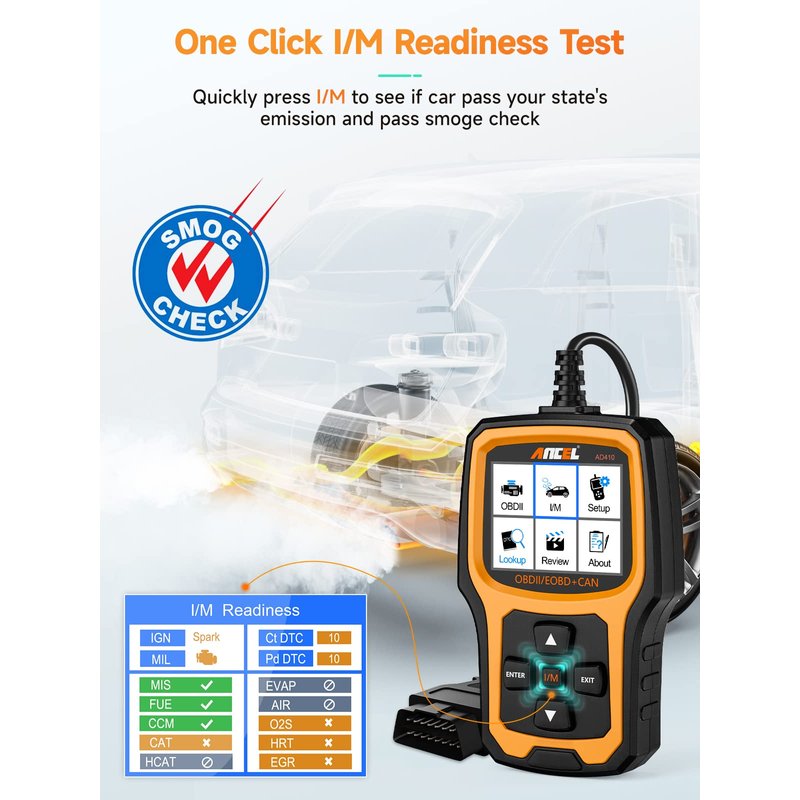 - QVGA DISPLAY & NEW UI - The AD410 code reader is a greatly improved upgrade from simpler diagnostic tools. It features a 2. 4" TFT true color display (262K) LCD for clear viewing of test results. With the clear design UI, users can easily access setup, OBDII diagnostics, I/M readiness and DTC search and check. No need to read the manual to know what to do, even for a beginner.