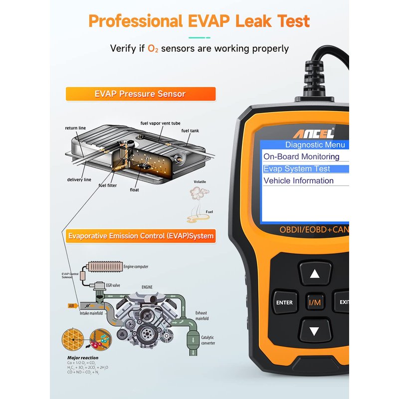 - ENHANCED OBDII DIAGNOSTICS - Supports O2 sensor and EVAP (evaporative control) system test. The AD410 code scanner can be used to initiate a leak test of a vehicle's EVAP system by monitoring the integrity of the fuel tank system. The O2 sensor test is used to monitor and adjust the air/fuel mixture, which can identify and correct problems related to fuel efficiency and vehicle emissions.