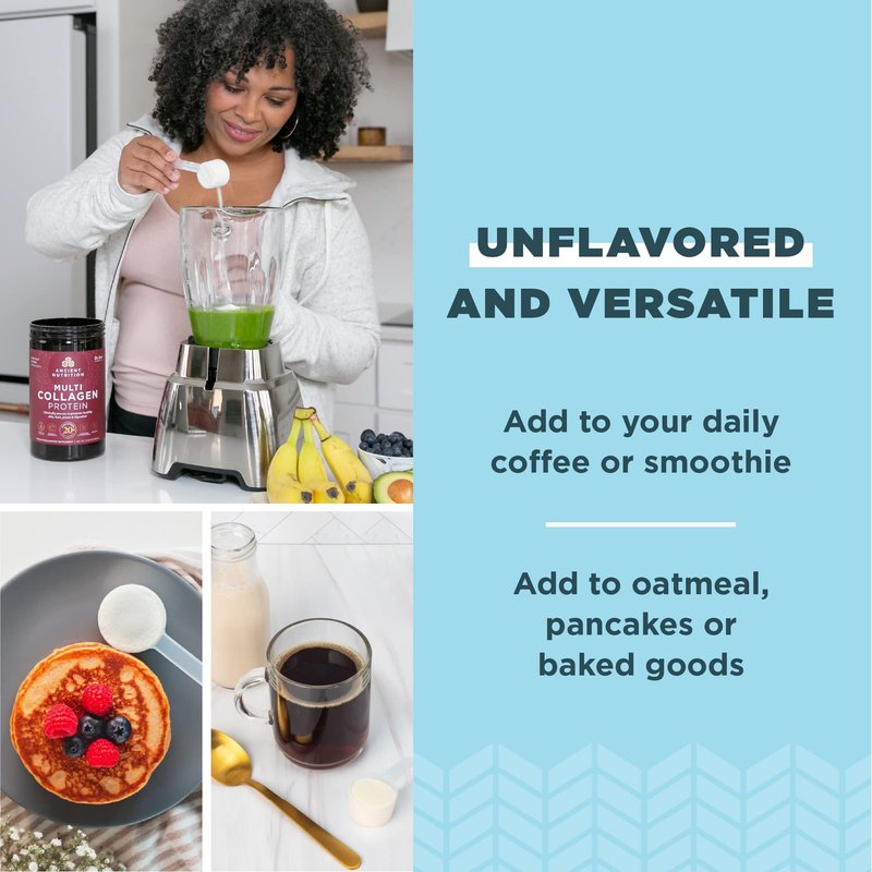 Ancient Nutrition’s award-winning Multi Collagen Protein offers fast results that last for rapid, continuous and persistent benefits! Packed with 5 types (I, II, III, V, X) and four different sources of collagen and clinically studied ingredients, Ancient Nutrition’s Multi Collagen Protein is presently the only product on the market with its fermented collagen ingredient that has human clinical studies showing the efficacy of the benefits. The fermented collagen ingredient in Multi Collagen Protein will get you noticeable results starting on day one! Let’s face it. When you start a health regimen you want to see results quickly, and Ancient Nutrition’s Multi Collagen Protein delivers. This health supplement with collagen from bovine, chicken, fish and eggshell membrane gives you results for your hair, skin, nails, joints and gut. That’s not all though, we’ve added a clinically studied proprietary premier collagen booster. This Vitamin C attracts to our cells like a magnet and has absorption and antioxidant capabilities. Including this Vitamin C ingredient in our formulation provides you powerful antioxidant properties and health benefits of helping to support the collagen synthesis process. At Ancient Nutrition we take pride in providing the highest quality products, and rigorously test them for purity and potency to ensure you are receiving products from clean, reliable sources. Just scoop, stir and enjoy in your coffee, tea, smoothie, soups, baked goods and more! This complete collagen formula is made without dairy, soy, grains and gluten can help support you on your health journey and get you the results you’re looking for starting at day one. Act now, and see why Multi Collagen Protein is an award winning collagen thousands have grown to love!