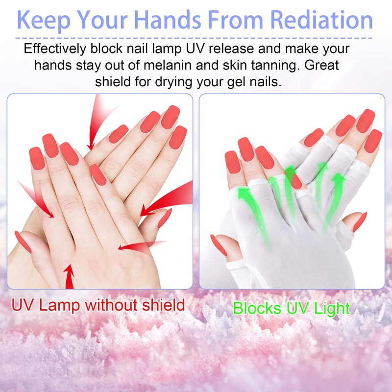 - Practical functions: This gel manicure UV shield gloves are specially designed to protect your hands from UV rays and excess radiation when drying your gel nails. It can shield UV released by nail lamp and directly isolate harmful light damage to the skin.