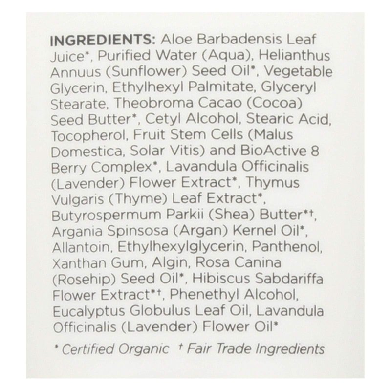 Lavender Thyme Refreshing Body Lotion 8 oz LotionProduct DescriptionThis ultimate skin food blends emollient rich rosehip and argan oils with shea and cocoa butters to nourish, smooth, and soften the appearance of dry skin. Refreshing lavender thyme delights the senses as superfruit antioxidants and ultra-hydrating aloe vera help protect and uplift skins moisture barrier for a luxurious, all-over body treatment.Directions Apply over body, absorbs quickly for satin smooth skin.Other Ingredients Aloe Barbadensis Leaf Juice, Purified Water (Aqua), Helianthus Annuus (Sunflower) Seed Oil, Vegetable Glycerin, Ethylhexyl Palmitate, Glyceryl Stearate, Theobroma Cacao (Cocoa) Seed Butter, Cetyl Alcohol, Stearic Acid, Tocopherol, Fruit Stem Cells (Malus Domestica, Solar Vitis) and BioActive 8 Berry Complex, Lavandula Officinalis (Lavender) Flower Extract, Thymus Vulgaris (Thyme) Leaf Extract, Butyrospermum Parkii (Shea) Butter, Argania Spinsosa (Argan) Kernel Oil, Allantoin, Ethylhexylglycerin, Panthenol, Xanthan Gum, Algin, Rosa Canina (Rosehip) Seed Oil, Hibiscus Sabdariffa Flower Extract, Phenethyl Alcohol, Eucalyptus Globulus Leaf Oil, Lavandula Officinalis (Lavender) Flower Oil Certified Organic Ingredients Fair Trade IngredientsWarnings Keep out of reach of children. As with all dietary supplements, consult your healthcare professional before use. See product label for more information.