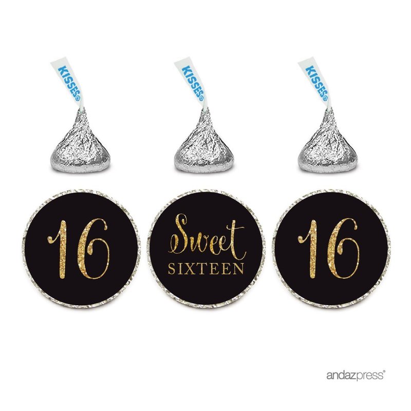 Andaz Press Gold Glitter Print Chocolate Drop Labels Stickers, Sweet 16 Birthday, Black, 216-Pack, Not Real Glitter, for Kisses Party Favors