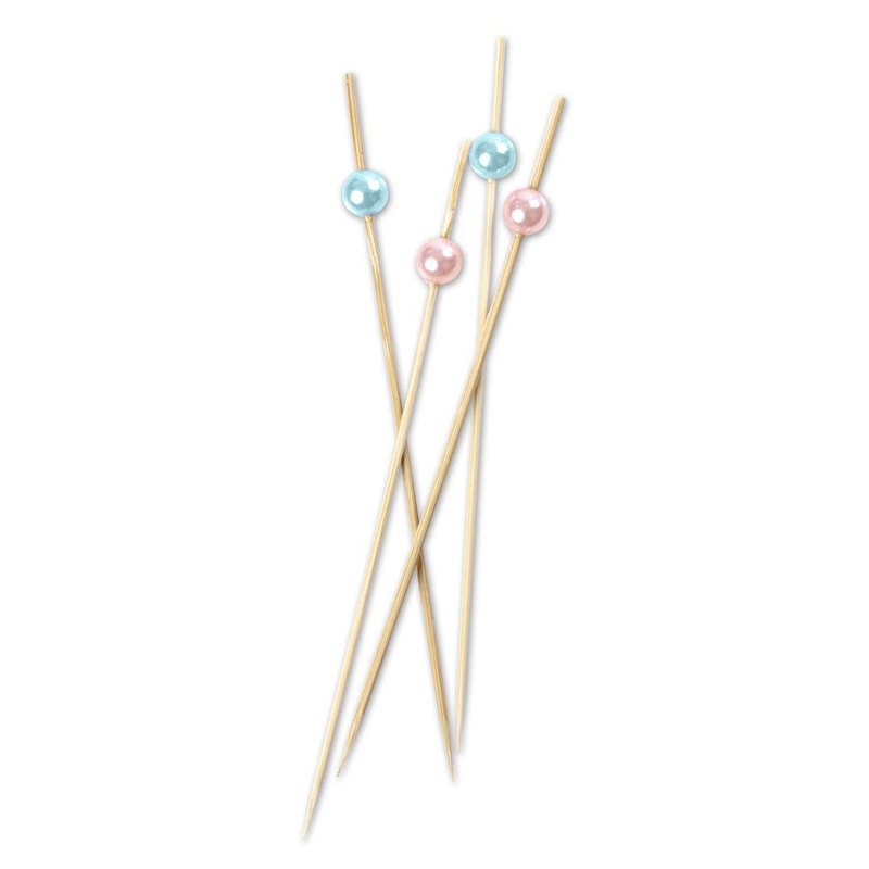- BULK 100. Includes bamboo wooden stirrer bar sticks with fancy pearl bead (50) Light Pink and (50) Light Blue. Fits perfectly in bar caddy or napkin holder. Bulk pack is great for at home bar, wedding bar or commercial bar.