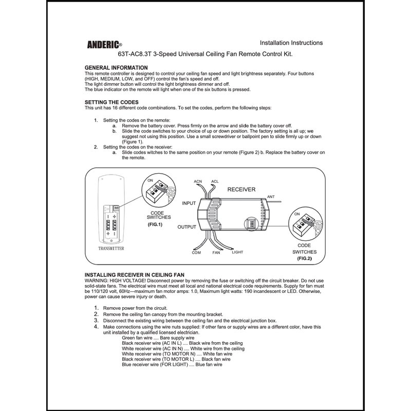 The Anderic Universal Ceiling kit is designed to work with all 3-speed fans. If you want to add remote control functionality to your fan, this kit is for you. Features: - Fan speeds: Off, low, med, high - Power - Time delay - Light on/off/dimming - Works lights with Incandescent, LED, CFL, and E-Ballast bulbs Works for all: - 3-speed fans with pull strings - 3-speed fans with remotes initially supplied with the same style receiver. The rectangular receiver that installs in the ceiling canopy. Works all major brands.