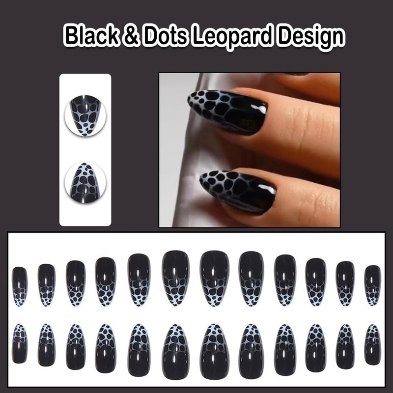 - ANDGING Black Press on Nails Almond Short Medium Fake Nails Glue on Nails with Dots Leopard Design 24Pcs Manicure Acrylic Women False Nails with Glue Gel Stick on Nail for Wedding KLW668D