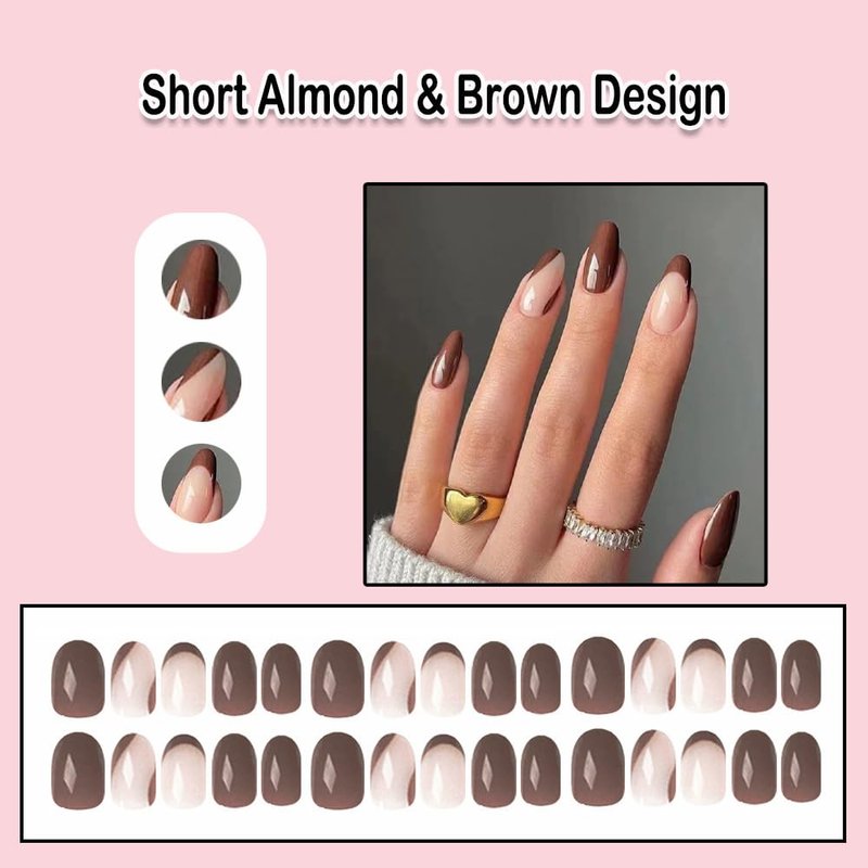 ANDGING Brown Press on Nails Almond French Tip Fake Nails with Glue Acrylic Glue on Nails with Designs ombre Natural Manicure False Nail for Women Gel Stick ons Nails for Wedding Birthday KDLA88