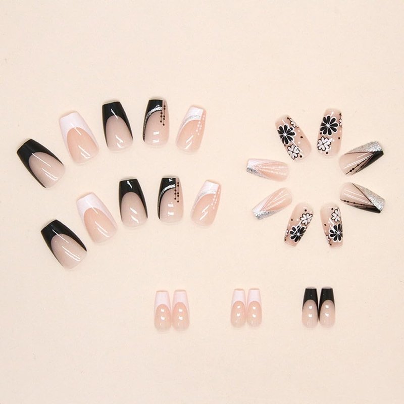 - ANDGING French Tip Press on Nails Coffin Short Medium Black White Fake Nails with Glitter Silver Flower Design Square Glue on Nails for Women Acrylic False Nails with Glue Stick on Nails for Wedding