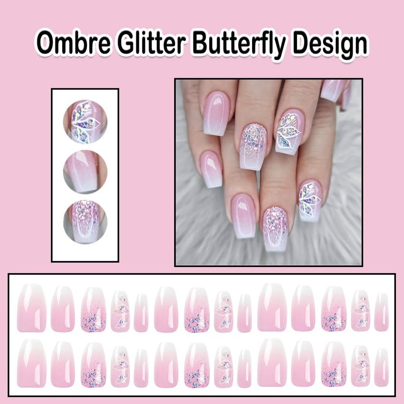 - ANDGING Press on Nails Short Medium Coffin Ombre Pink and White Fake Nails with Glitter Butterfly Design Square Glue on Nails for Women Acrylic False Nails with Glue Stick on Nails for Wedding Birthday