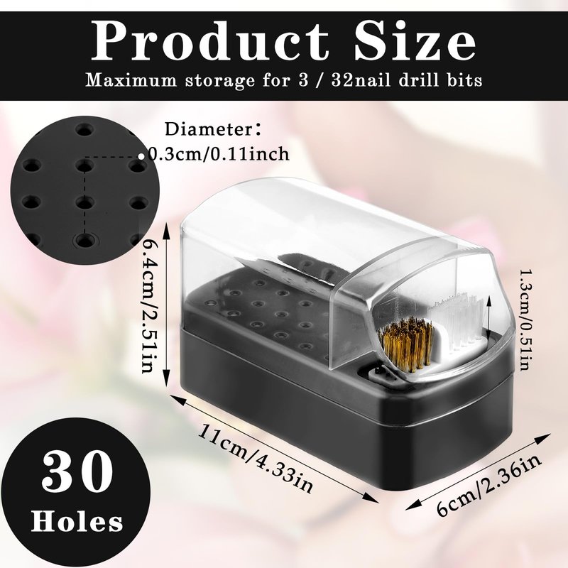 - 【30-Hole Nail Drill Bit Holder】Our Nail Drill Bits Holder boasts 30 precision-calculated holes and a perfectly sized dustproof cover. It provides ample storage space for 3/32'' nail drill bits, 3/32'' carbide nail drill bits, ceramic nail drill bits, e-file nail drill bits, and more. The acrylic cover offers protection against dust, keeping your desktop tidy and visually appealing.