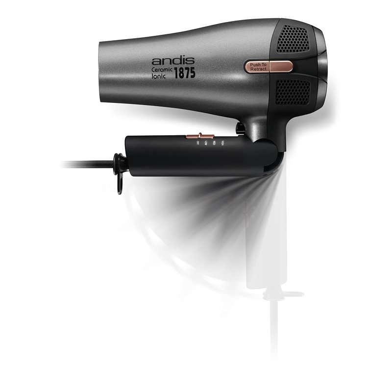Andis 80280 Fold-n-go 1875 Watt Ceramic Ionic Dryer, Retractable Cord, Lightweight with Professional Blowout Results, Quick Drying Blow Dryer, Black/Silver