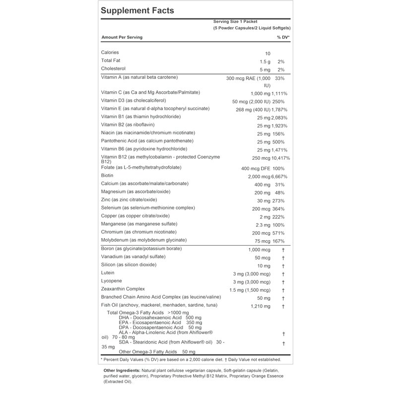 - SUPERIOR 100% PURE BIO-ACTIVE INGREDIENTS – Provides high potencies of all essential vitamins, minerals and carotenoids, including Vitamin A, vitamin C, Vitamin D3, Vitamin E, B-complex vitamins, Calcium, Magnesium, Zinc, Selenium, Copper, Manganese, Chromium, Molybdenum, Boron, Vanadium, Silicon, Lutein, Lycopene, Zeaxanthin Complex, Branched Chain Amino Acid and 1,000 mg Omega-3 Fatty Acids. Contains NO Milk / Dairy-Free, Gluten-Free; NO Additives of Any Kind.