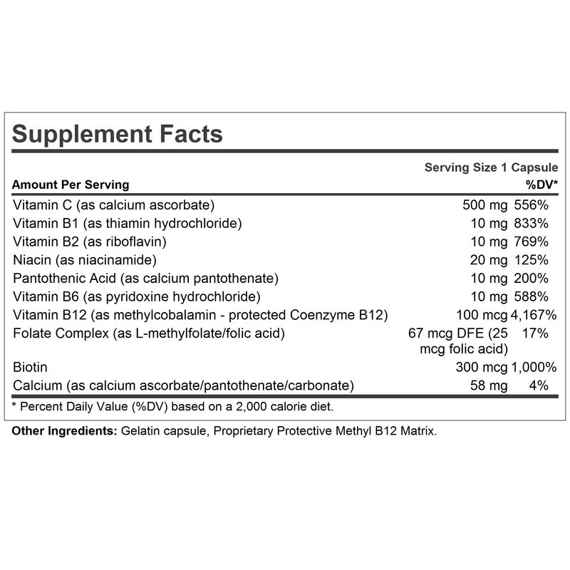 VITAMIN C 500 + B-COMPLEX is a 100% additive-free, natural complex of vitamin C plus all the essential B-complex vitamins, including our unique absorption-protected methylcobalamin (natural coenzyme vitamin B12), as well as our metabolically active folic acid (methyl folate). The vitamin C in this product is entirely in the form of a water-based mineral ascorbate (calcium ascorbate), which is entirely non-acidic, so it will not upset your stomach. This special form of vitamin C promotes the greatest utilization of vitamin C without the stomach discomfort, loss of potency and rapid nutrient loss associated with ordinary ascorbic acid. Vitamin C is a powerful antioxidant that supports the health of numerous body tissues and systems. Finally, because they are easily depleted by stress, including illness and strenuous exercise, and are key factors in the metabolism of food and creation of energy in the body, we include high potencies of all of the B-complex vitamins.