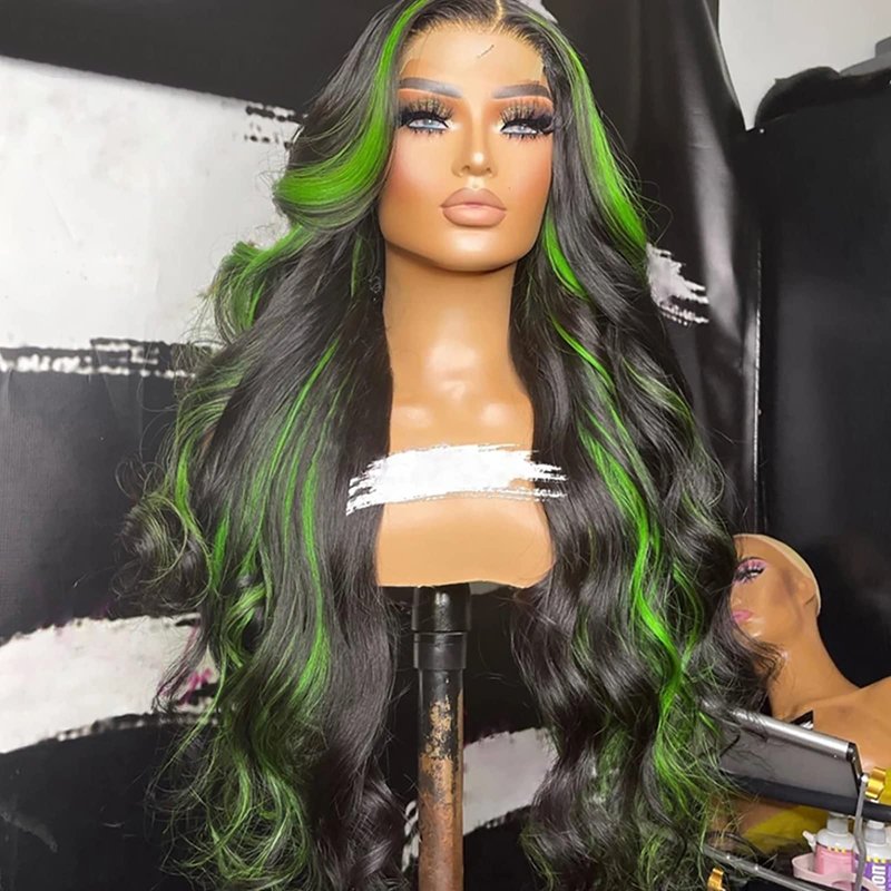 - ANDRIA Green Skunk Stripe Colorful Lace Front Wigs Long Body Wave Glueless Natural Wave Glueless lace Wig Synthetic Heat Resistant Fiber Hair Wig Pre Plucked With Baby Hair For Women 24 Inch