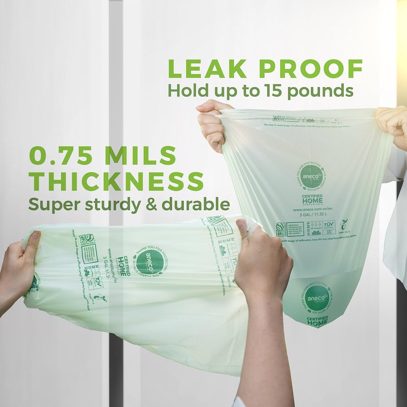 - π πππππππ ππ§π ππ ππππ: If youβve faced leaking issues by using flimsy trash bags, try our 100% Compostable ANECO trash bags. The ANECO trash bags is 0.75mils thick giving you full assurance to throw wet food scrap in worry-free of leaking issues. In addition to being extra thick, the ANECO compostable trash bags can carry weights up to 15 pounds. It is recommend that you should change the trash bags every two days to ensure hygiene.