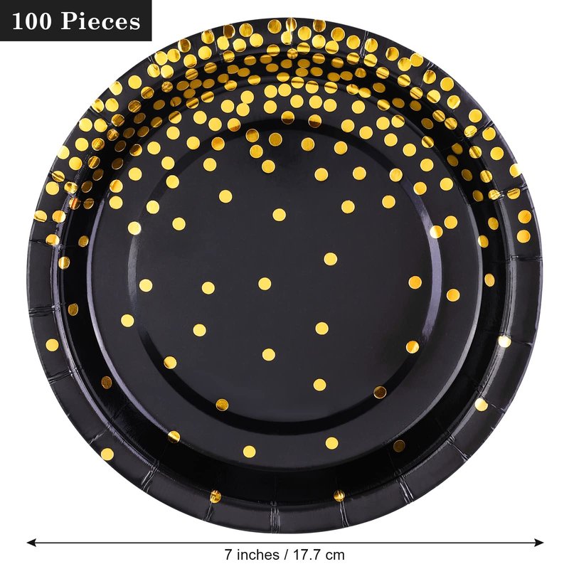 Aneco 100 Pieces 7 Inches Black and Gold Paper Plates Gold Foil Dot Dessert Plates Party Paper Plates for Party, Birthday, Wedding Party Supplies