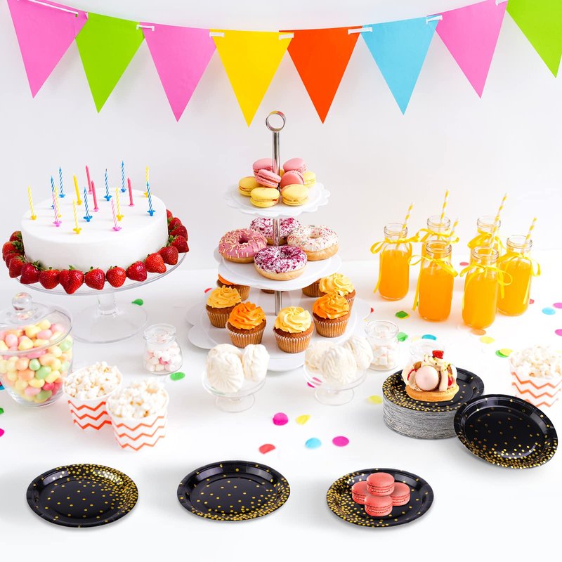- Wide range of uses: each of the black and gold paper plates measures about 7 inches / 17.7 cm in diameter, proper size to hold many kinds of foods, such as desserts, snacks, fruits, snacks, etc.