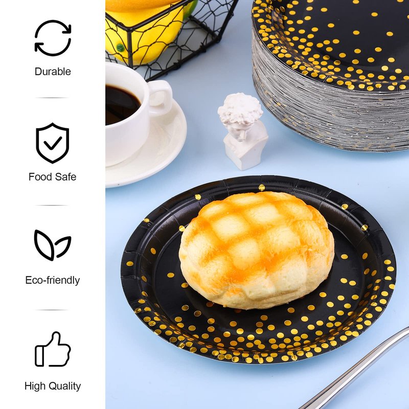 - Unique design: these disposable paper plates are designed with gold dots, which are distributed around the plate unevenly, delicate and stylish, your guests will be surprised and enjoy their meal in the elegant and happy atmosphere