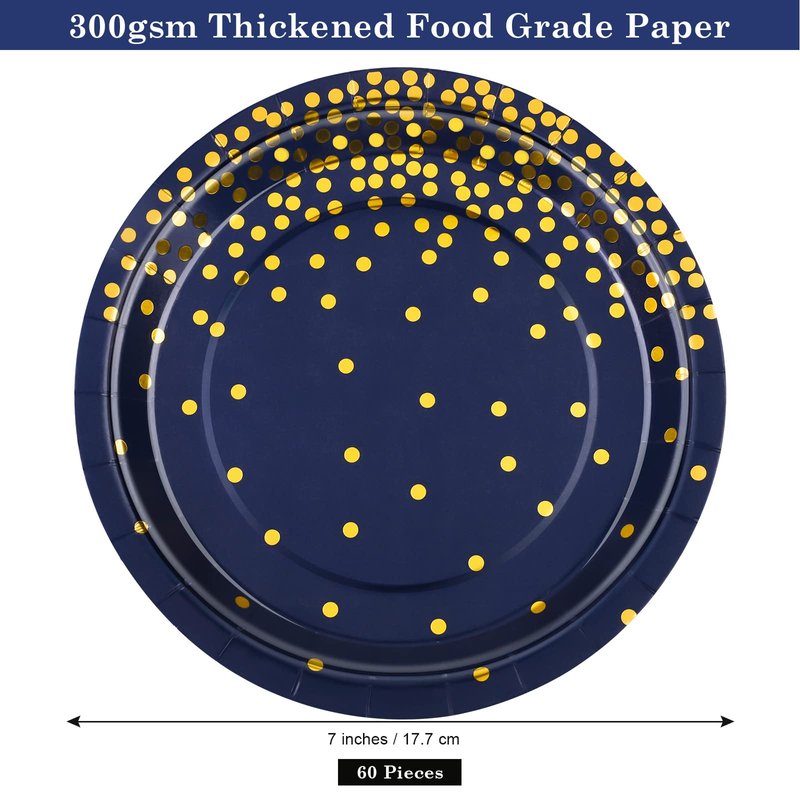 Aneco 60 Pieces 7 Inches Disposable Paper Plates Navy Blue Paper Plates Blue and Gold Foil Dot Dessert Plates Round Paper Plates for Wedding Bridal Shower Birthday Party Decorations