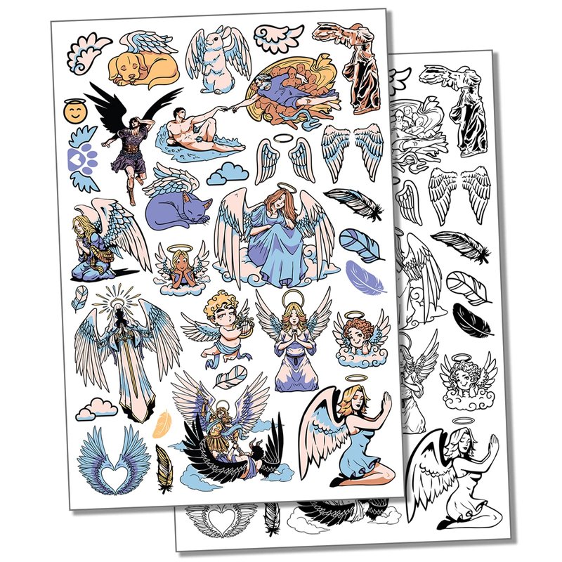 Angel Wings Feathers Cherubs Religious Temporary Tattoo Water Resistant Fake Body Art Set Collection - Black (One Sheet)