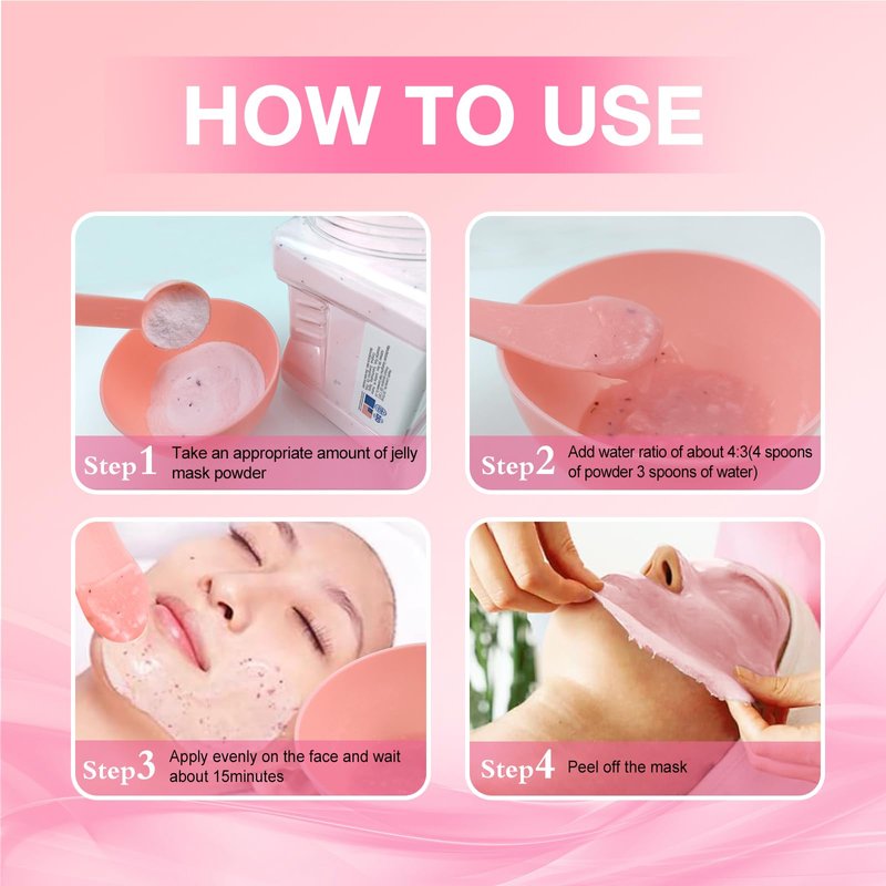 - 【EASY TO USE】 Mix the jelly mask powder and water in the bowl in a 4:3 ratio until combined. If you feel that it is too thin and it will slide down your face, you can add more powder. If you feel that it is too dry to fully absorb, you can add some water. The jelly face mask is fast acting, does not drip, and need 20 minutes of regular use for lasting results.