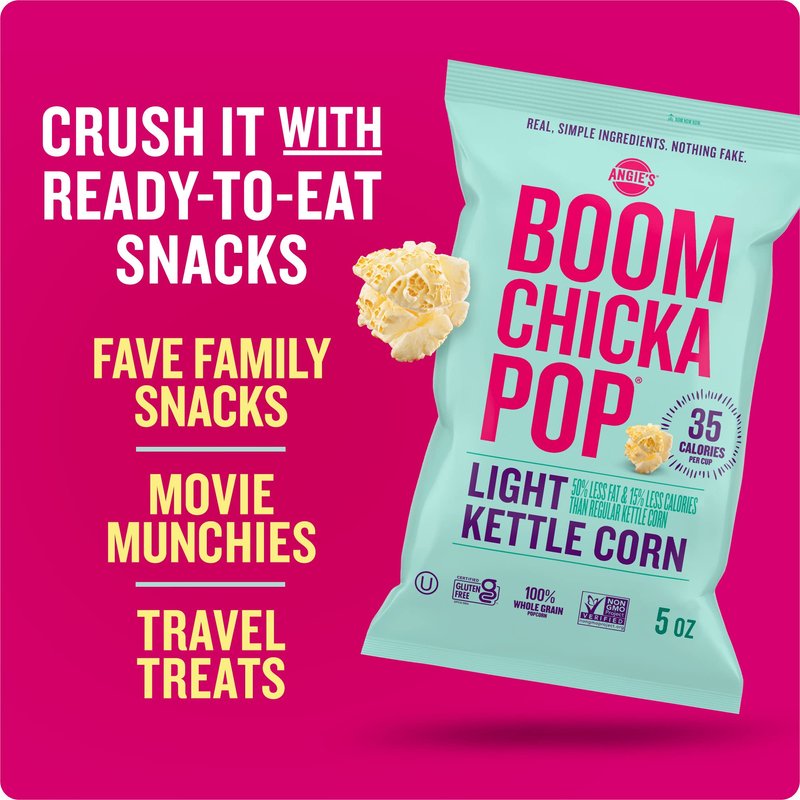 - Contains four 5-ounce bags of Angie's BOOMCHICKAPOP Light Kettle Corn Popcorn