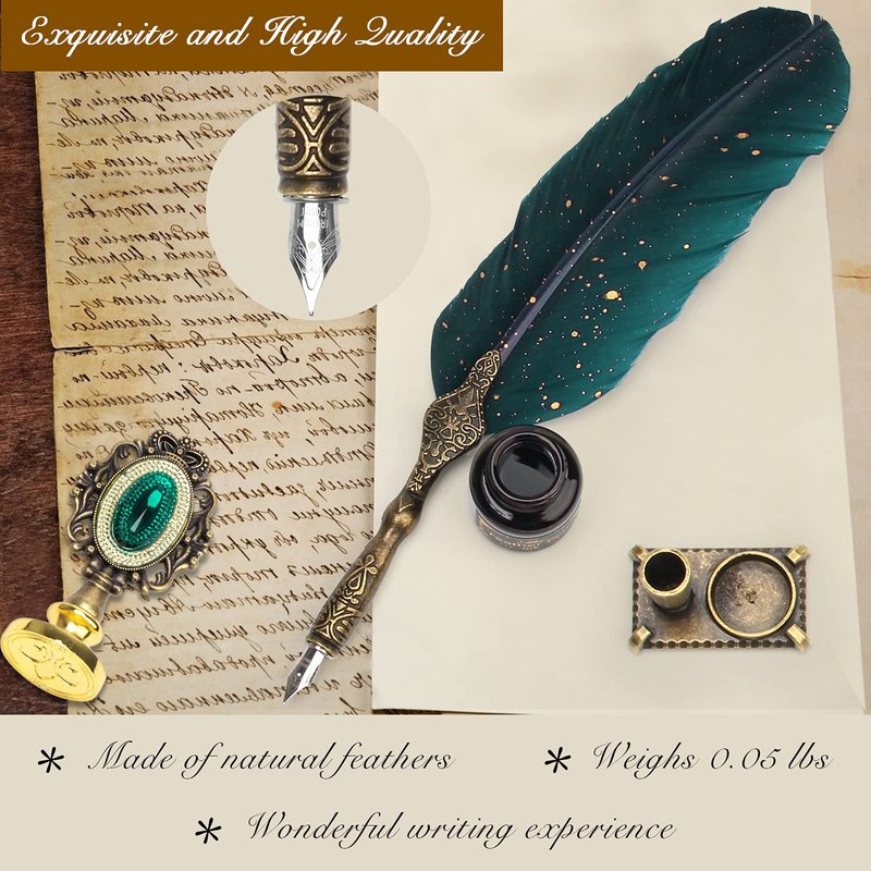 Anglekai Quill Pen and Ink Set, Calligraphy Feather Pen with Wax Seal Stamp, Ink, and Wax Seal Sticks, Replacement Nibs, Spoon, Envelope Letter Paper, White Wax, Best Gift for Birthday (Green)