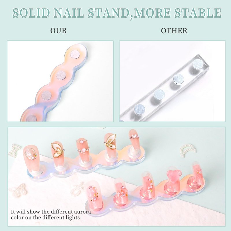 - 🌷【Unique Appearance】The nail stands for press ons set are designed to nice shape, adds a touch of elegance and style to your nail grooming routine. The transparent press on nail stand set is not only a practical nail tool, but also a decorative element for your nail table. Tip: Please remove the protective film on the bottom for better effect.It will show the different aurora color on the different lights, and the aurora base can display a set of 10 nails.